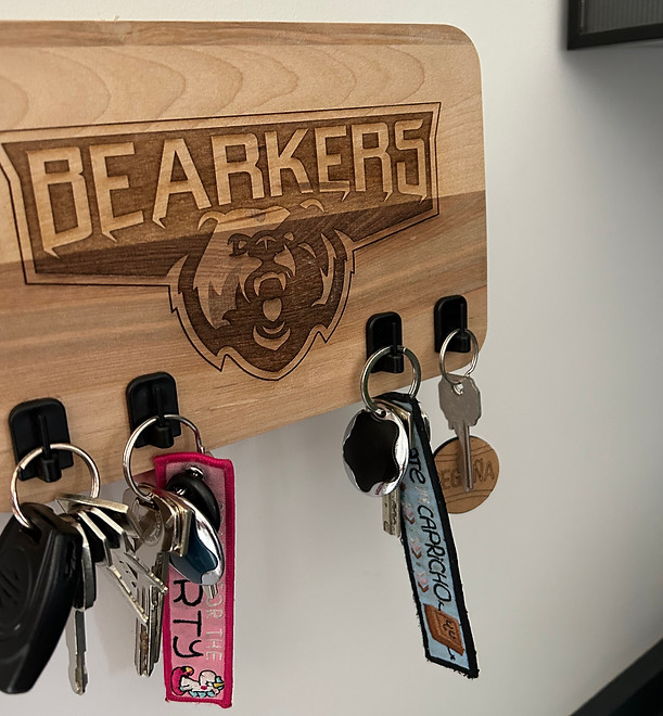 Práctico organizador para casco, chaqueta y guantes, compuesto por una sólida base de hierro muy estable, donde se fija un poste de madera de 180 cms, personalizado con el logo Bearkers y al que se ha atornillado un colgador de casco, una bandeja portaobjetos y un soporte para percha, todo en hierro negro lacado.